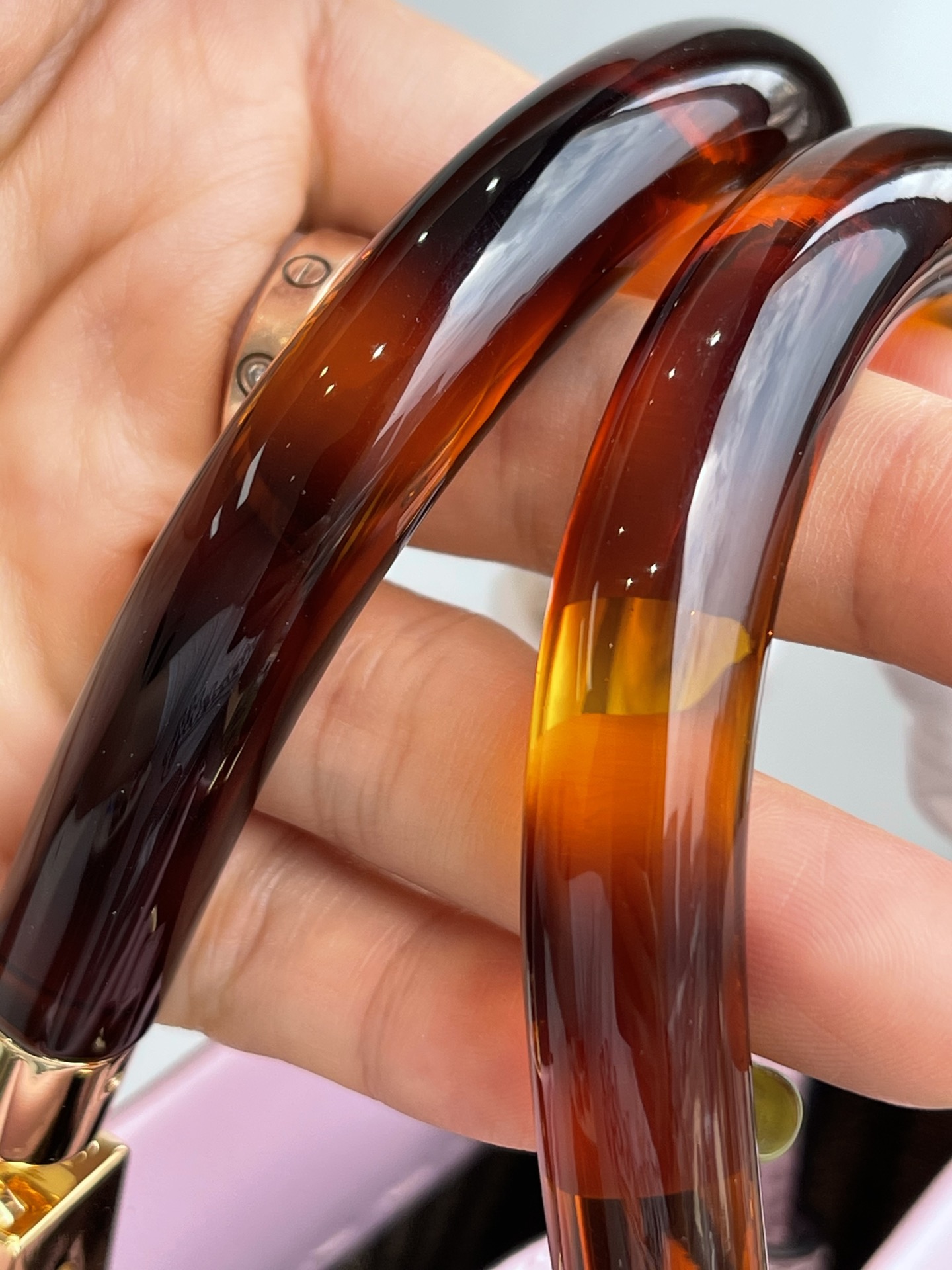 Let's take a look at the hardware details. Pure copper and real gold electroplated hardware. The handle is made of ACRYLIC, which is more resilient and shiny than gum, looks in two colors, gives a very good visual experience, and feels smooth and comfortable, not holding one is hard to describe the feeling in hand ??.