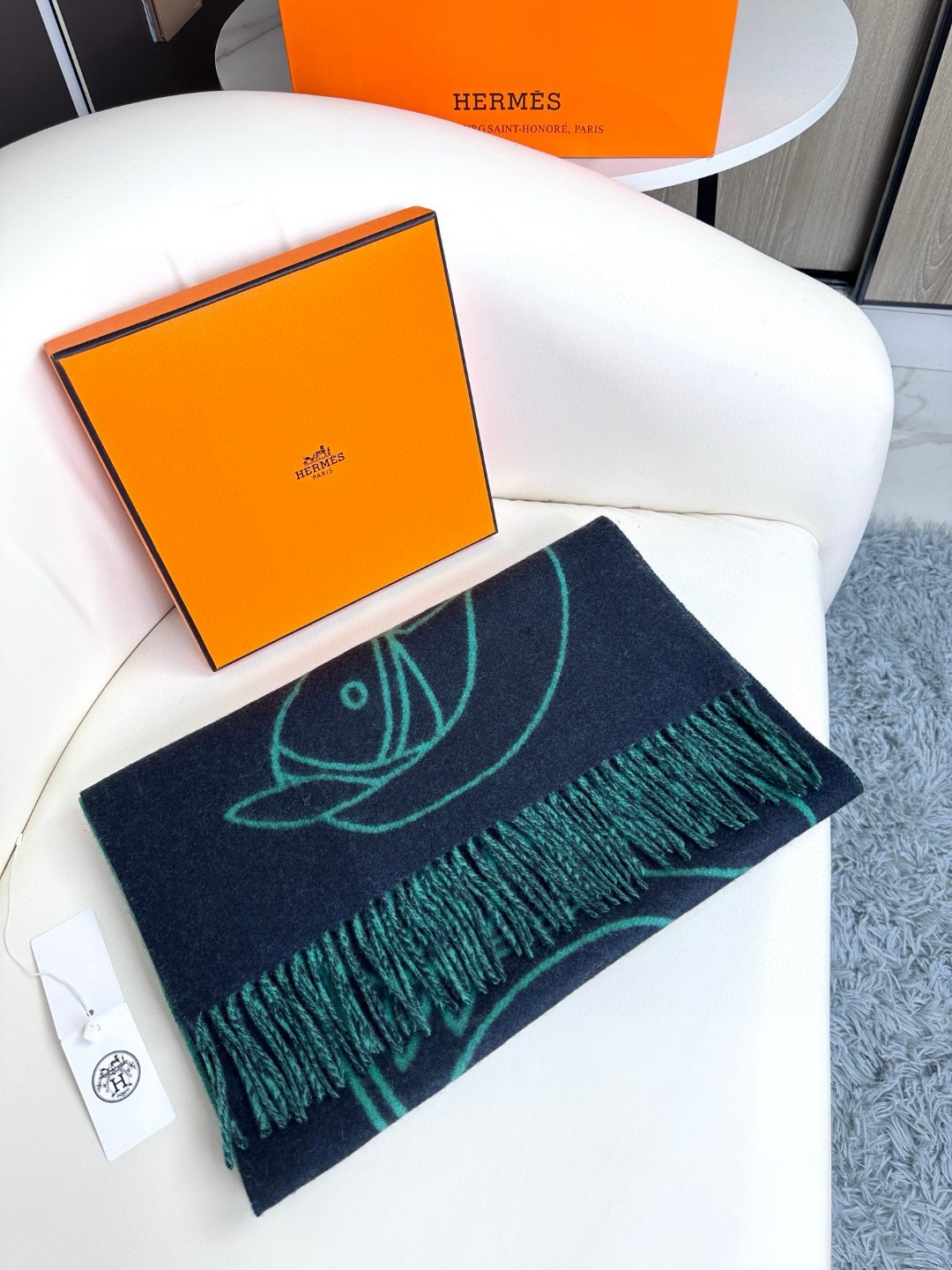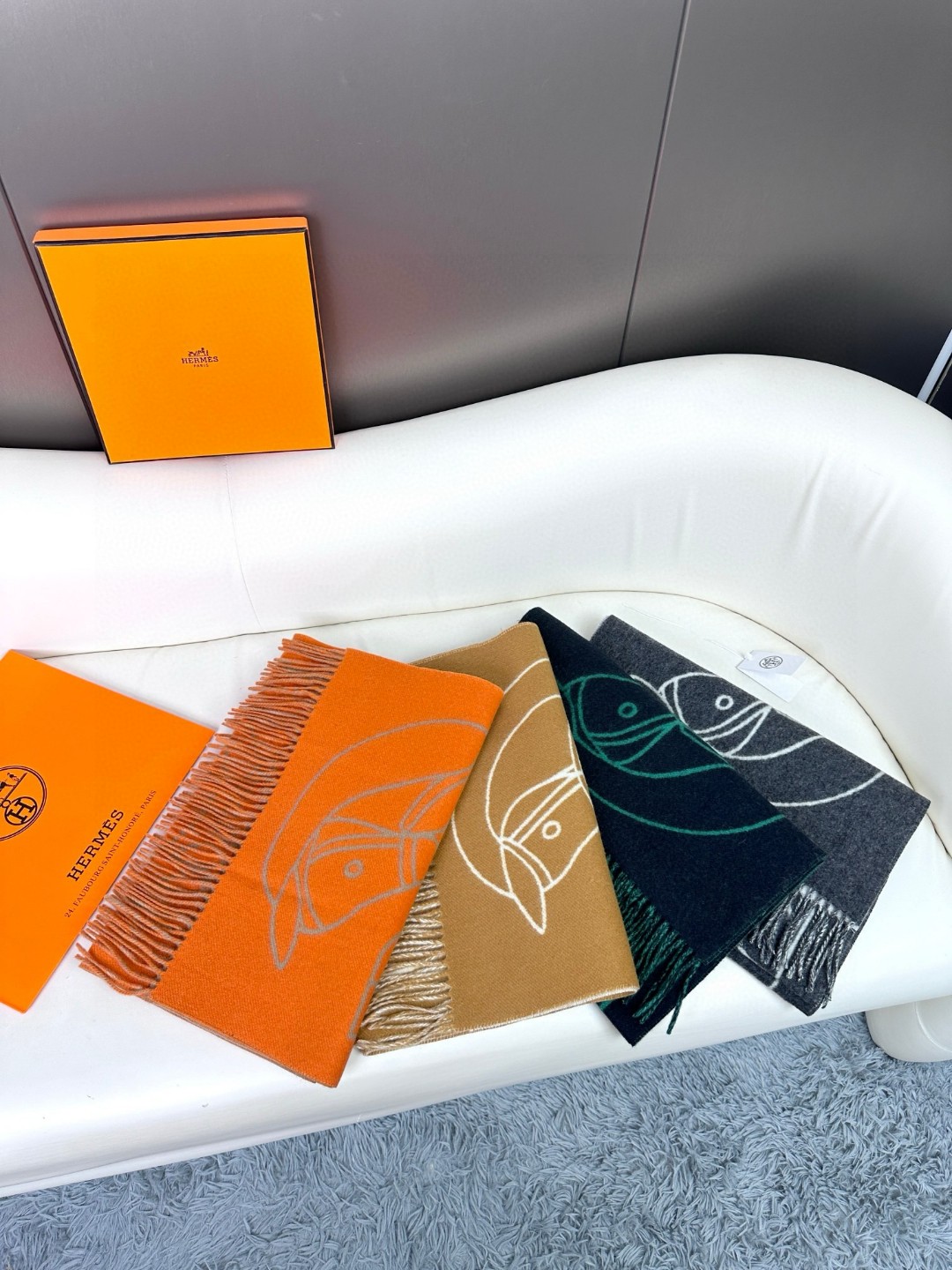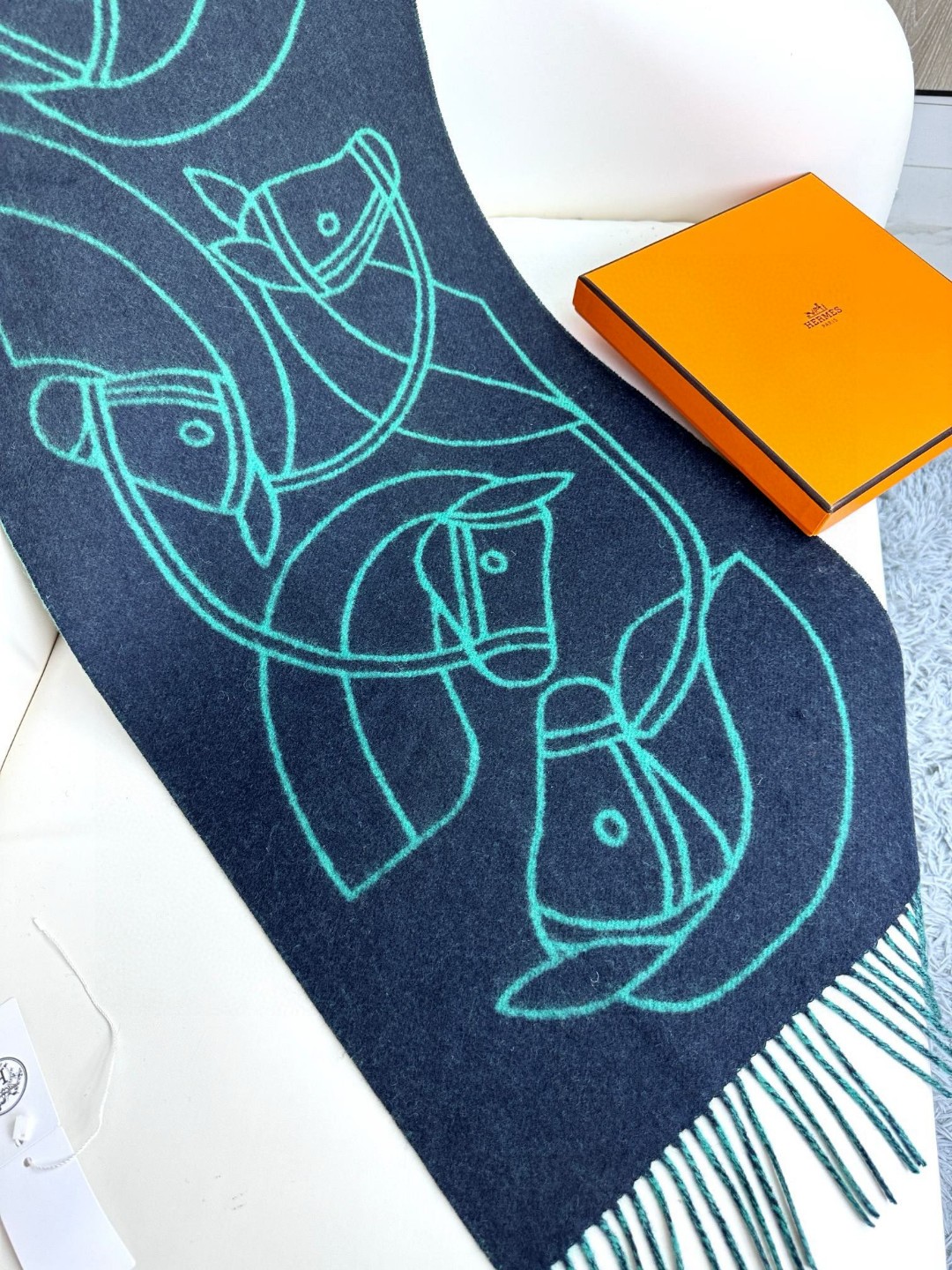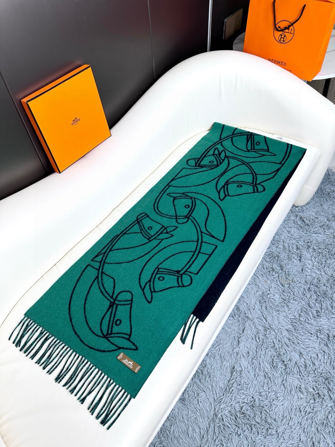 This new Hermes scarf features a delicate color-blocking jacquard weaving, presenting the Entrelacs Equestres horse head pattern designed by Geoff McFetridge. The size is 40*195CM